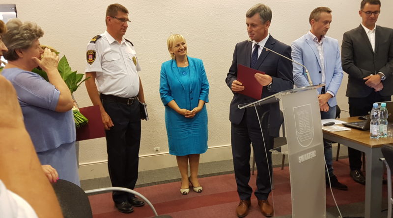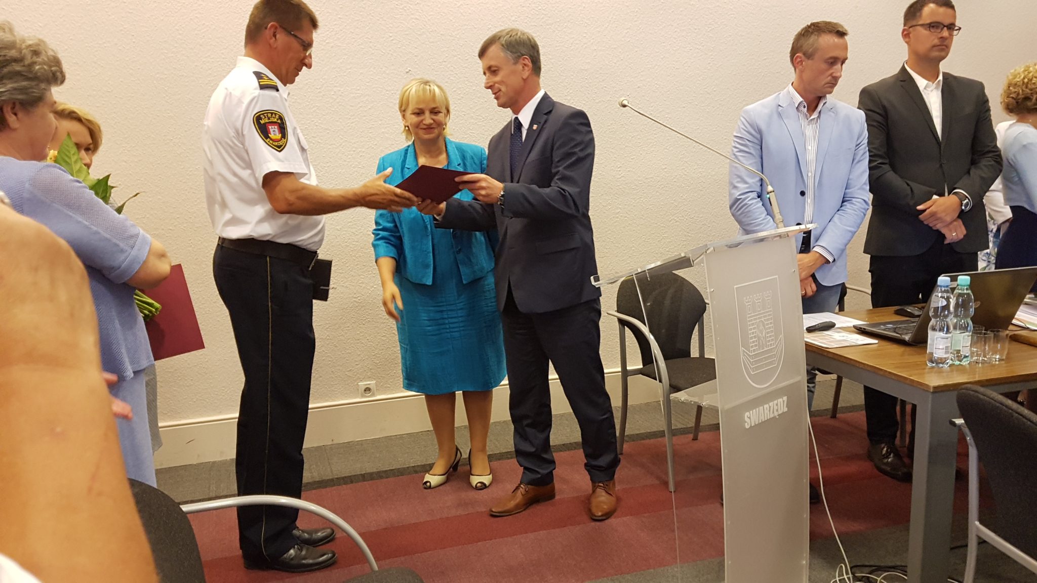 29 sierpnia na Sesji Rady Miejskiej burmistrz Marian Szkudlarek i przewodnicząca Rady Miejskiej Barbara Czachura złożyli na ręce komendanta Straży Miejskiej w Swarzędza Piotr Kubczaka życzenia w imieniu mieszkańców gminy i władz samorządowych życzenia z tej okazji dla wszystkich strażników miejskich w Swarzędzu