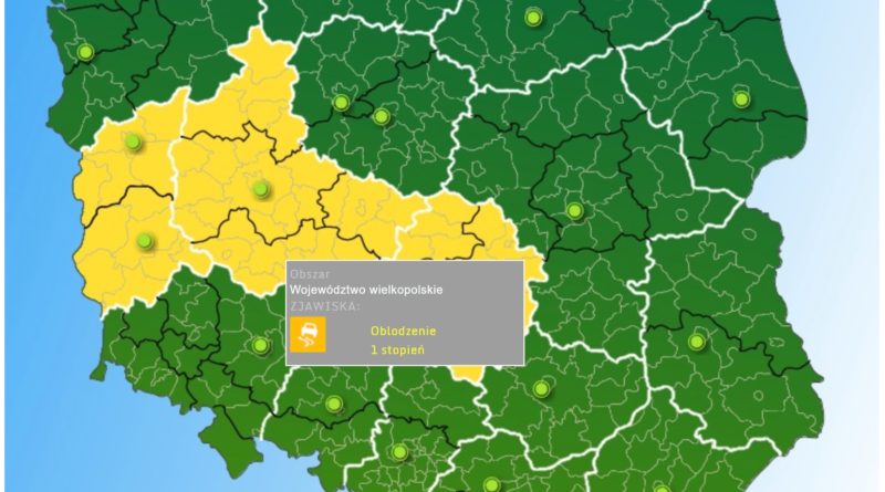Instytut Meteorologii i Gospodarki Wodnej wydał ostrzeżenie pierwszego stopnia dla województwa wielkopolskiego dotyczące możliwości wystąpienia oblodzeń (skala od 0 do 3, gdzie 0 to brak ostrzeżeń, a 3 to najwyższy stopień ostrzeżeń).