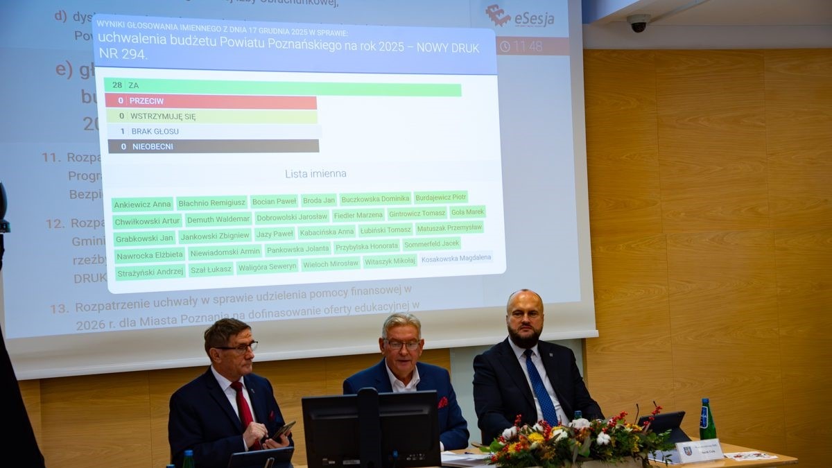 Podczas sesji Rady Powiatu budżet powiatu poznańskiego na 2026 rok został uchwalony jednogłośnie, obejmując plan finansowy o wartości blisko 1 mld zł oraz nadwyżkę budżetową w wysokości 69 mln zł. Zgodnie z przyjętymi założeniami najwięcej środków trafi na oświatę, drogi oraz szeroko rozumianą politykę społeczną.