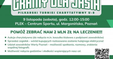 Czytaj dalejPiłkarski Turniej Charytatywny „Gramy dla Jasia” rocznik 2012 i młodsi. 9 listopada g. 12.00-15.00 w Centrum Sportu PLEK rozegrany zostanie