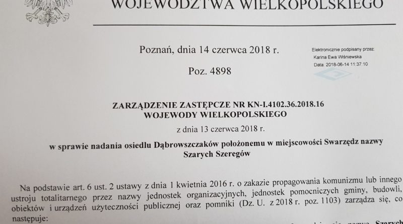 13 czerwca b.r. Wojewoda Wielkopolski Zbigniew Hoffmann wydał zarządzenie zastępcze w sprawia nadania osiedlu Dąbrowszczaków, położonemu w miejscowości Swarzędz, nazwy Szarych Szeregów.