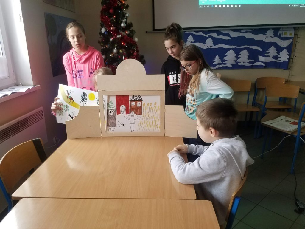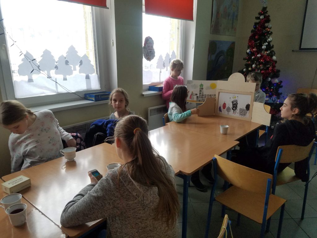 Po emocjonujących rozgrywkach planszowych uczestnicy półkolonii przeżyli przygodę z teatrem Kamishibai – starą japońską tradycją opowiadania historii za pomocą tekstu i stworzonych do niego kolorowych ilustracji. Dzieci poznały historię tej dalekowschodniej formy teatru, budowę teatralnej sceny oraz zasady prowadzenia spektaklu. Po obejrzeniu spektaklu O tym, jak diabły chciały zatopić Poznań, przygotowanego przez kierownika biblioteki pedagogicznej, uczniowie spróbowali własnych sił opowiadając legendę O założeniu Poznania za pośrednictwem teatru Kamishibai.