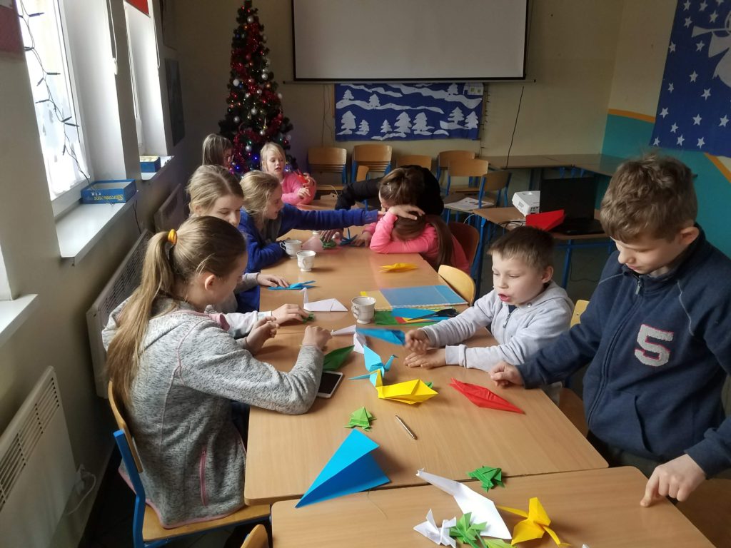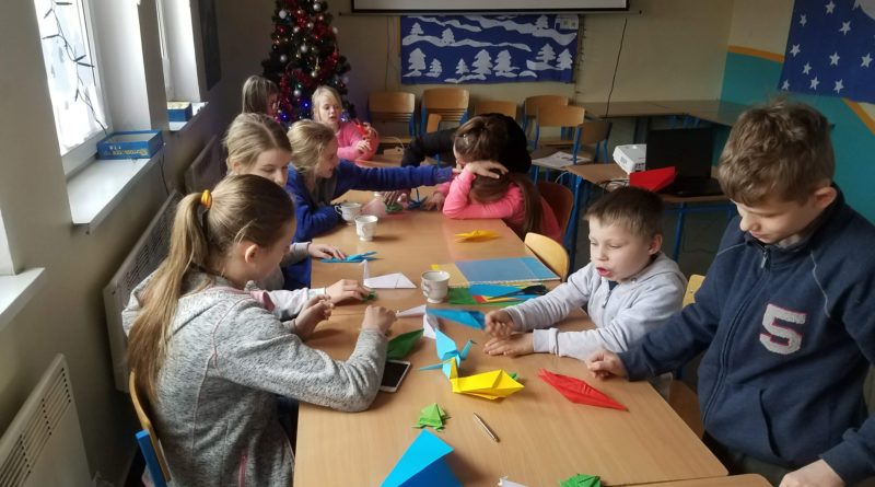 Pozostając w atmosferze orientu, na zakończenie zajęć w świetlicy, uczestnicy spotkania wzięli udział w warsztatach origami. Uczniowie poznali podstawowe zasady sztuki składania papieru i wykonali przestrzenne figury zwierząt. Efektem pracy dzieci jest utworzona wystawa w gruszczyńskiej świetlicy.