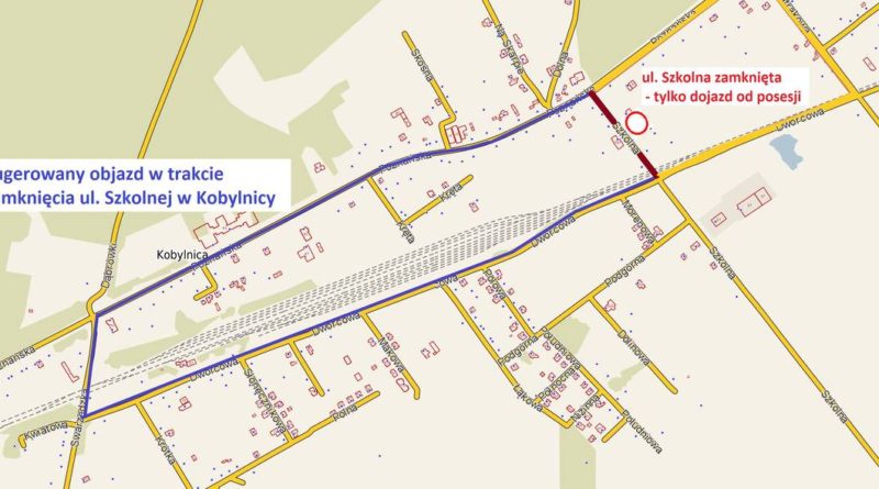 W związku przebudową ul. Szkolnej w Kobylnicy i budową sieci kanalizacji deszczowej w tym rejonie od 23.04.2018 r. na okres ok. 2 miesięcy zostanie zamknięta dla ruchu pojazdów ul. Szkolna w Kobylnicy, na odcinku od ul. Poznańskiej do przejazdu kolejowego przy ul. Dworcowej. Tylko mieszkańcom ul. Szkolnej zostanie umożliwiony dojazd do posesji.