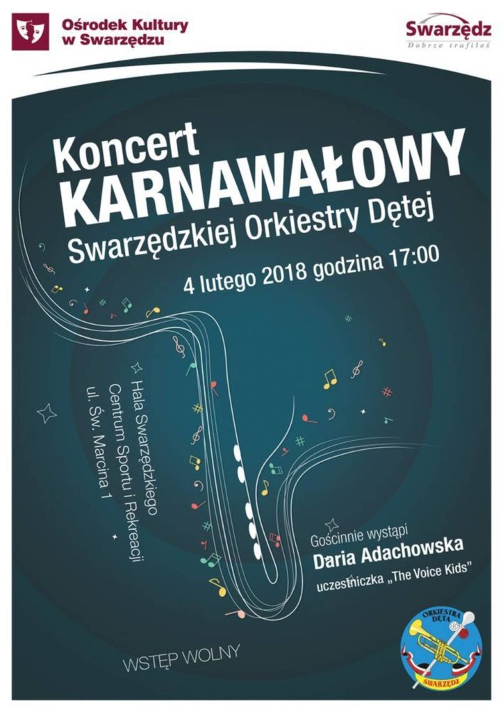Będzie muzycznie, spontanicznie, radośnie i, jak zawsze, z dużym poczuciem humoru. Swarzędzka Orkiestra Dęta wykona największe przeboje polskiej muzyki rozrywkowej i z pewnością porwie publiczność do wspólnej zabawy. Gościem specjalnym koncertu będzie uczestniczka telewizyjnego talent show „The Voice Kids”, Daria Adachowska, która jest również laureatką gminnego konkursu piosenki „Zostań Gwiazdą”.