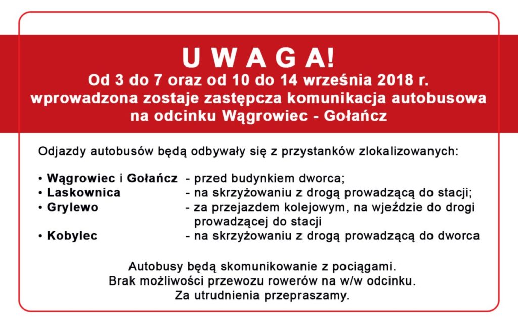 Z uwagi na prace remontowe prowadzone na odcinku Wągrowiec – Gołańcz przez zarządcę infrastruktury – PKP PLK S.A. w dniach od 3 do 7 oraz od 10 do 14 września wprowadzona zostanie Zastępca Komunikacja Autobusowa (ZKA). Odjazd autobusów odbywał się będzie z przystanków zlokalizowanych następujących miejscach: