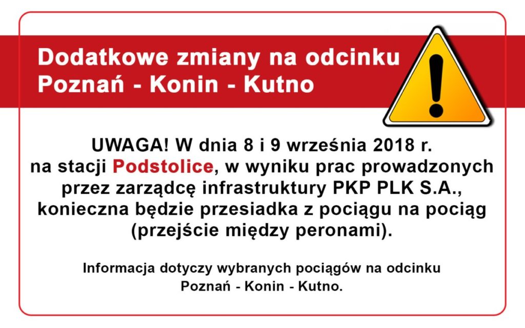– poc. nr 77845 rel. Konin (18:47) – Poznań Gł. (20:17) będzie odjeżdżał o 23 min. później (obecnie odjazd ze stacji Konin o godz. 18:24),