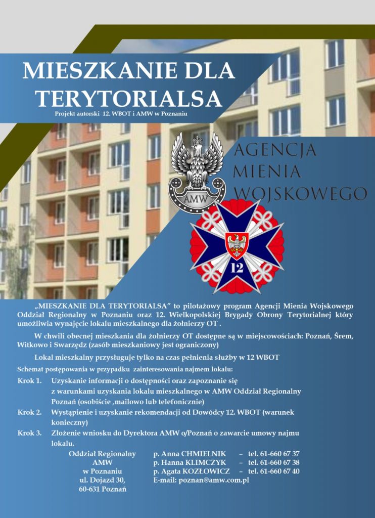 Program „Mieszkanie dla Terytorialsa” to inicjatywa i efekt wspólnych działań poznańskiego oddziału Agencji Mienia Wojskowego i 12 Wielkopolskiej Brygady Obrony Terytorialnej. Dowódca 12 Wielkopolskiej Brygady Obrony Terytorialnej – płk Rafał Miernik, wychodzi w ten sposób naprzeciw potrzebom swoich żołnierzy. Cieszy nas, że Agencja Mienia Wojskowego poparła nasze potrzeby, dzięki czemu żołnierze WOT będą mogli wynająć mieszkanie z zasobu AMW. Mamy nadzieję, że ten pilotażowy program sprawdzi się i będzie podstawą do dalszej współpracy WOT i Agencji – podsumowuje dowódca 12 Wielkopolskiej Brygady Obrony Terytorialnej, płk Rafał Miernik.