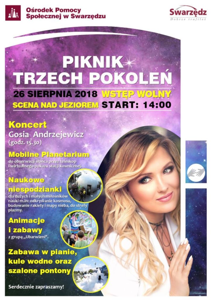Ośrodek Pomocy Społecznej w Swarzędzu zaprasza 26 sierpnia 2018 roku w godzinach od 14.00 do 18.00 na Piknik Trzech Pokoleń. Gwiazdą tegorocznego Pikniku będzie Gosia Andrzejewicz, która pojawi się na Scenie nad Jeziorem ok. godziny 15.30.