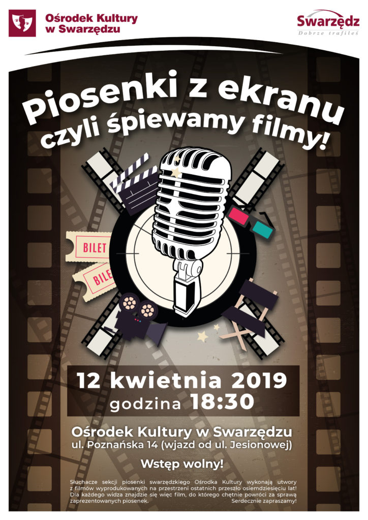 Słuchacze sekcji piosenki swarzędzkiego Ośrodka Kultury zapraszają na koncert filmowy, podczas którego wykonają utwory z filmów wyprodukowanych na przestrzeni ostatnich przeszło osiemdziesięciu lat!