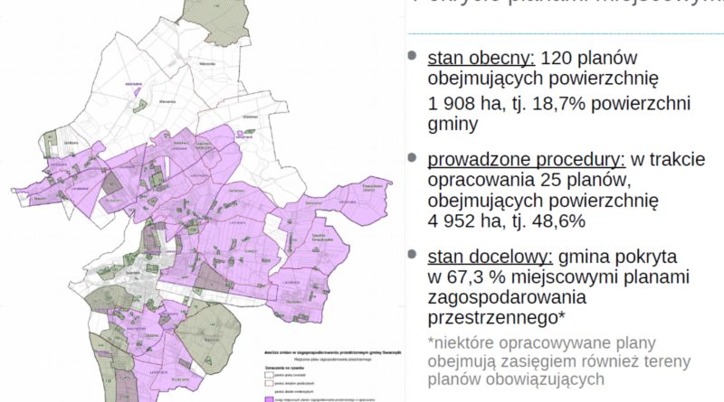 W chwili obecnej na terenie gminy obowiązuje 120 planów obejmujących powierzchnie 1908 ha, co stanowi 18,7% powierzchni gminy. W trakcie opracowywania jest 25 planów obejmujących 4952 ha, to znaczy 48,6% powierzchni. Stanem docelowym jest pokrycie powierzchni gminy w 67,3% miejscowymi planami zagospodarowania przestrzennego.
