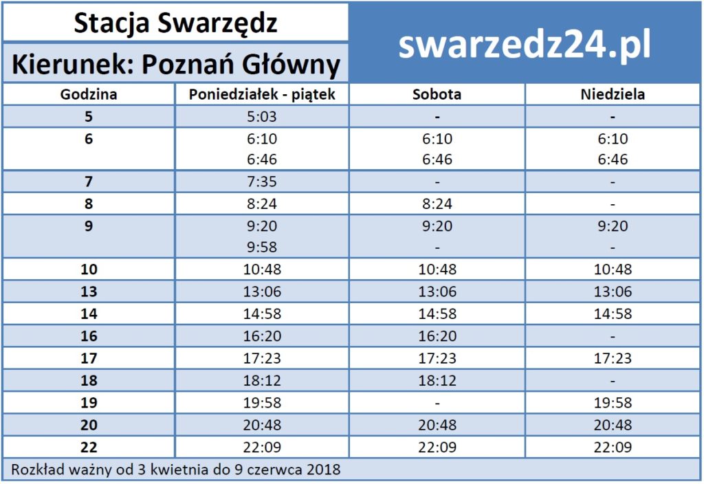 Rozkład jazdy ze stacji Swarzędz w kierunku stacji Poznań Główny (ważny od 3 kwietnia do 9 czerwca 2018)Rozkład w większej rozdzielczości do wydruku można pobrać klikając na poniższy obraz.