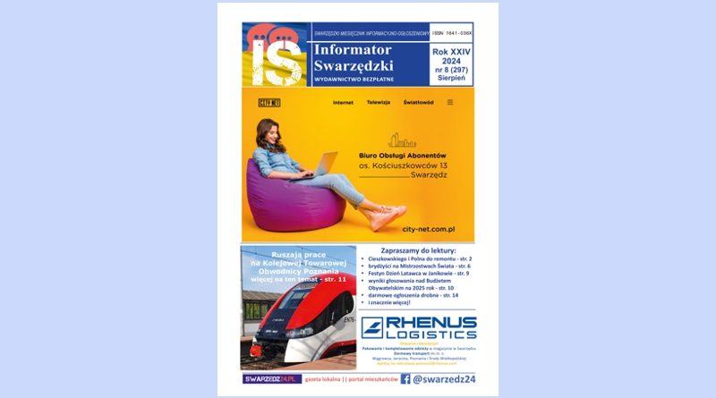 Dopiero co zaczął się sierpień, a już pojawił się najnowszy numer Informatora Swarzędzkiego – sierpniowe wydanie naszego miesięcznika (numer 8 (297)/2024). Miesięcznik w wersji papierowej można znaleźć w wielu punktach usługowych i handlowych na terenie miasta i gminy Swarzędz, a także w wybranych miejscach w gminach sąsiednich – Pobiedziska, Kostrzyn i Kleszczewo. Informator Swarzędzki ukazuje się w formie tradycyjnej gazety, ale również w przyjaznej użytkownikom wersji internetowej. Informator jest w Swarzędzu od 24 lat i od samego początku jest bezpłatny. Zachęcamy do zapoznania się z najnowszym wydaniem Informatora Swarzędzkiego!