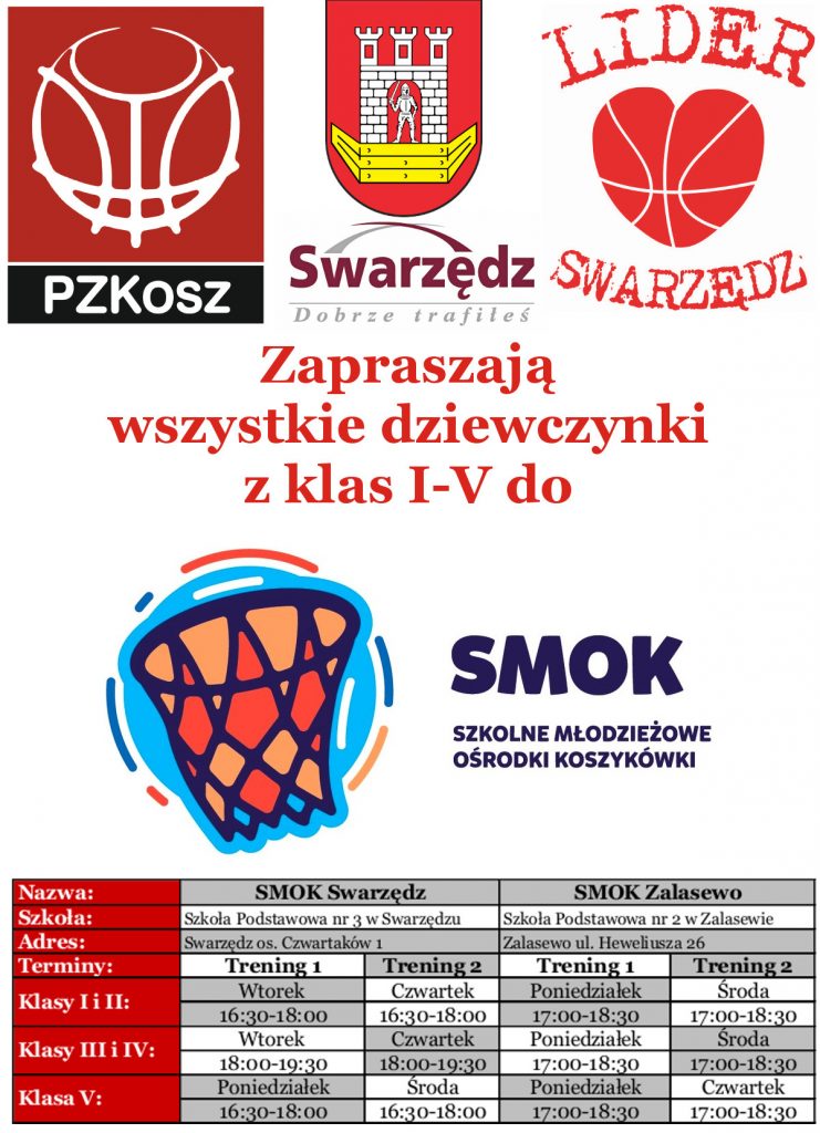 Nowy sezon przyniósł wielkie zmiany w funkcjonowaniu sekcji koszykówki UKS Lider Swarzędz, szczególnie na poziomie dzieci. Dzięki bardzo dobrej postawie młodych Liderek w rozgrywkach młodzieżowych w zeszłym sezonie Polski Związek Koszykówki przyznał Swarzędzowi projekty koszykarskie KOSSM i SMOK. Największy wpływ na funkcjonowanie sekcji będzie miał projekt SMOK, czyli Szkolny Młodzieżowych Ośrodek Koszykarski. Urząd Miasta i Gminy, Polski Związek Koszykówki oraz UKS Lider Swarzędz podpisali umowę na mocy, której w naszej gminie od września wystartują dwa całkowicie bezpłatne ośrodki szkolenia dla dziewczynek. Jeden ośrodek działać będzie w Szkole Podstawowej nr 3 na os. Czwartaków, a drugi w Szkole Podstawowej nr 2 w Zalasewie. Dzięki temu każda z dziewczynek, która chce trenować koszykówkę może bez problemu dojechać na zajęcia unikając korków. Zajęcia w obu ośrodkach odbywają się na trzech poziomach: klasy I-II, klasy III-IV i klasy V. Na każdym poziomie dziewczynki mają dwa darmowe treningi, co w sumie daje aż 12 jednostek treningowych dla dzieci. UKS Lider Swarzędz dokłada od klas IV dodatkowe trening, które przygotowywać będą młode koszykarski do rozgrywek ligowych. Zapraszamy wszystkie chętnie dziewczynki na darmowe zajęcia koszykarskie. Harmonogram zajęć znajduje się na stronie sekcji www.uksliderswarzedz.pl oraz FaceBook’u.