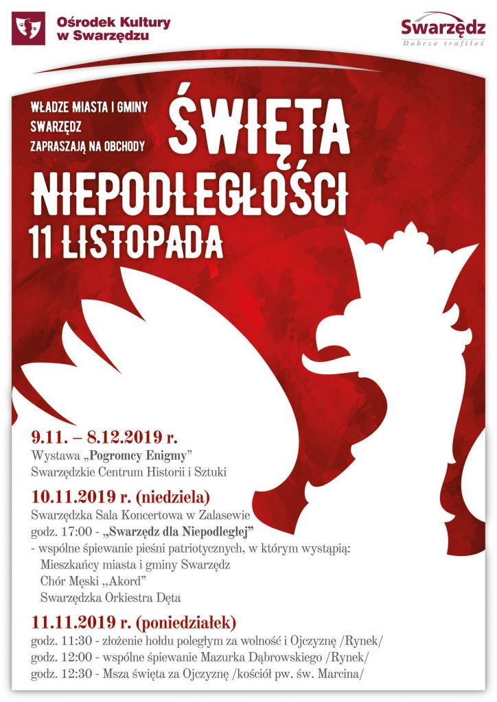 W Swarzędzu z okazji Święta Niepodległości 2019 odbędą się tradycyjne, miejskie obchody 101. rocznicy odzyskania przez Polskę niepodległości. W oficjalnych uroczystościach można wziąć udział, udając się 11 listopada na Rynek w Swarzędzu.