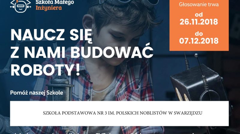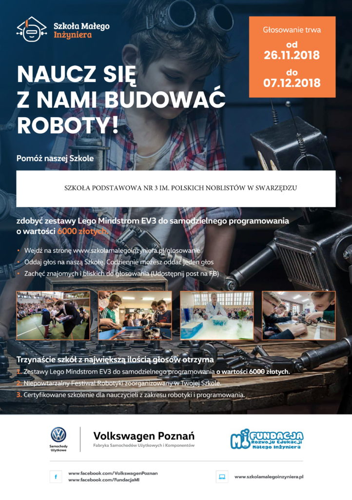 Szkoła Podstawowa nr 3 im. Polskich Noblistów w Swarzędzu została zgłoszona do projektu “Szkoła Małego Inżyniera” organizowanego przez Volkswagen Polska i Fundację Małego Inżyniera. W konkursie tym nasza placówka może zdobyć cenne zestawy do prowadzenia zajęć z robotyki dla dzieci oraz możliwość organizacji festiwalu nauki w szkole.