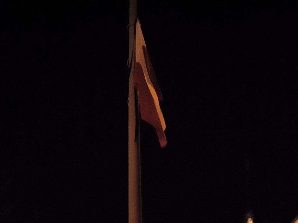 Przybyli zgromadzili się wokół masztu z polską flagą opuszczoną do polowy i przepasaną żałobną wstęgą. W ciszy i skupieniu składali wokół masztu zapalone znicze.