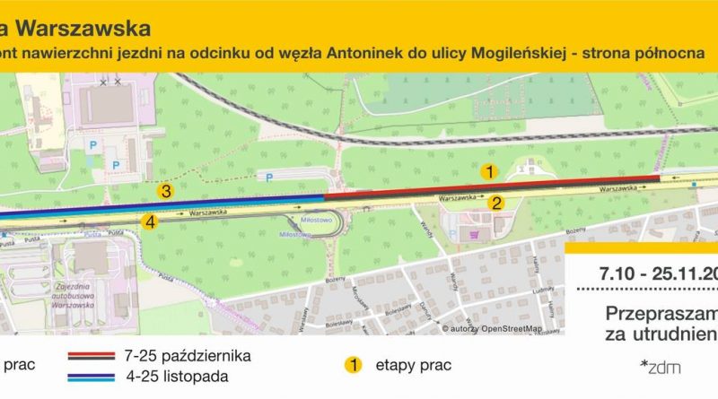 Prace będą prowadzone pod ruchem, a poszczególne fragment jezdni będą wygrodzone na czas remontu. Autobusy komunikacji publicznej będą kursowały bez zmian. Mając na uwadze okres Wszystkich Świętych, prace na jezdni zostaną wstrzymane od 26 października do 3 listopada, aby umożliwić dojazd do cmentarza na Miłostowie.