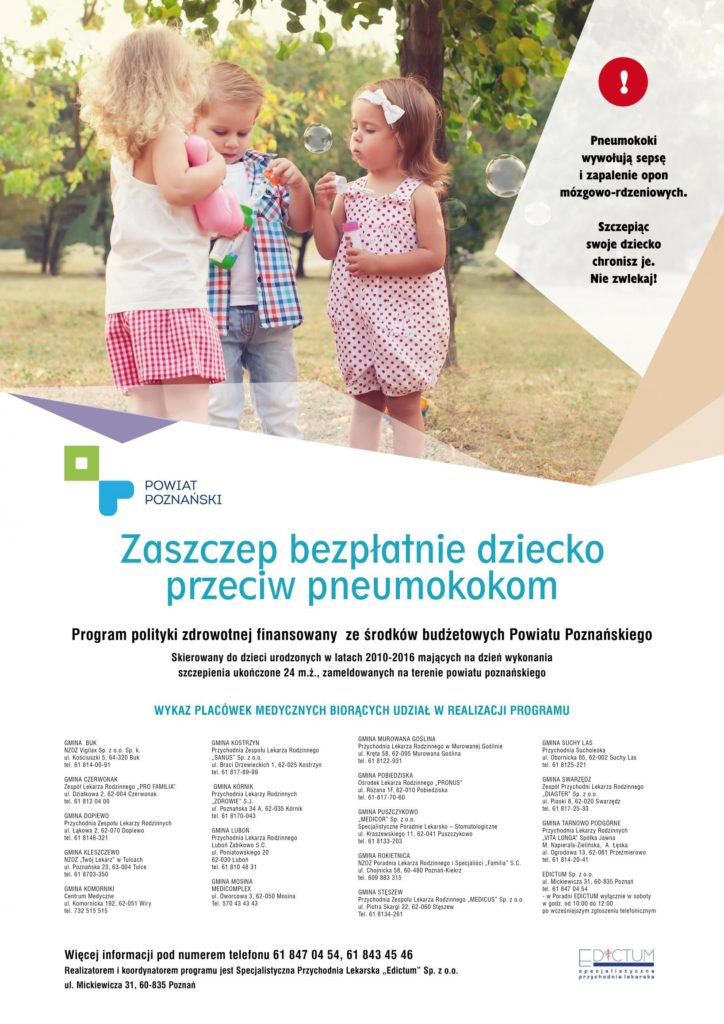 21 maja 2018 r. na terenie Powiatu Poznańskiego rozpocznie się akcja szczepień chroniących dzieci przed zapaleniem płuc, zapaleniem opon mózgowo-rdzeniowych czy sepsą. Program w całości finansowany jest ze środków budżetowych Powiatu Poznańskiego. Władze zadbały, aby zagwarantować maluchom jak najlepszą z dostępnych na rynku ochronę – w ramach szczepienia otrzymają one szczepionkę 13-walentną o obecnie najszerszym pokryciu. Program realizowany będzie do 21 grudnia br. (lub do wyczerpania zapasów) w kilkunastu placówkach medycznych na terenie Powiatu. Realizatorem i koordynatorem programu jest Specjalistyczna Przychodnia Lekarska. „Edictum”. Szczegółowe informacje nt. akcji można uzyskać pod numerem telefonu (61) 847 04 54 lub osobiście w siedzibie EDICTUM przy ul. Mickiewicza 31, I piętro, pok. 120. Z myślą o rodzicach i opiekunach, którzy mają wątpliwości czy szczepić dziecko lub chcieliby dowiedzieć się więcej na temat infekcji pneumokokowych zorganizowano cykl spotkań edukacyjnych. Spotkania odbędą się na terenie 17 gmin. Harmonogram spotkań dostępny jest na stronie www.edictum.pl w zakładce „Programy” – Pneumokoki Powiat Poznański.