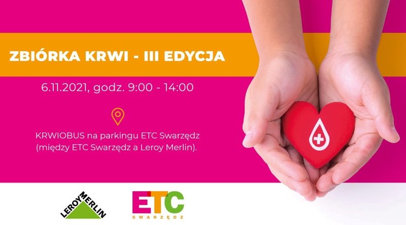 „ZBIÓRKA KRWI” organizowana jest przez Leroy Merlin i ETC Swarzędz we współpracy z Regionalnym Centrum Krwiodawstwa i Krwiolecznictwa z Poznania. Krwiobus zaparkuje pomiędzy ETC a Leroy Merlin w godz. 9:00-14:00.